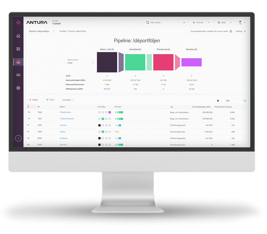 Överblick över samtliga projekt, med möjlighet att analysera, prioritera och styra utvecklingen av projektportföljen mot strategiska mål.